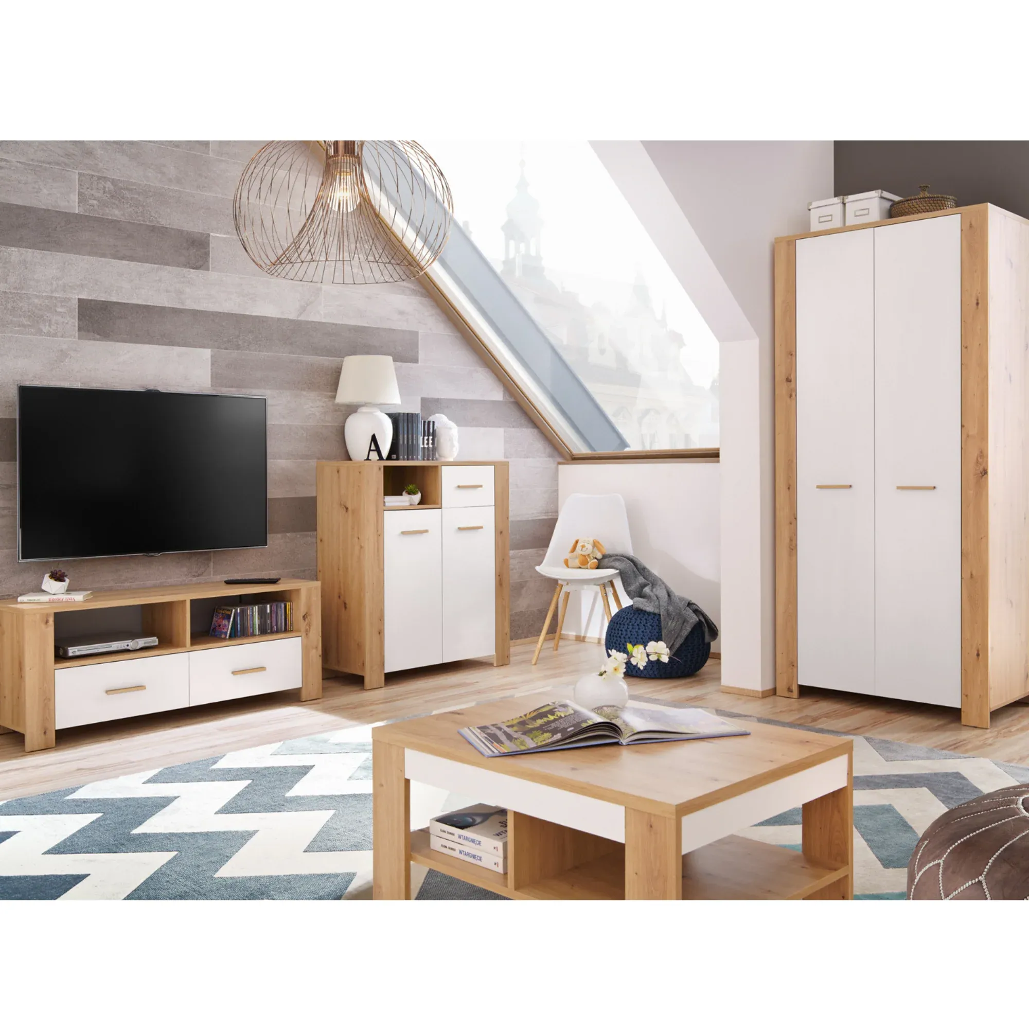 VEGA II – Ensemble de Meubles de Salon – Chêne Wotan / Blanc Matt